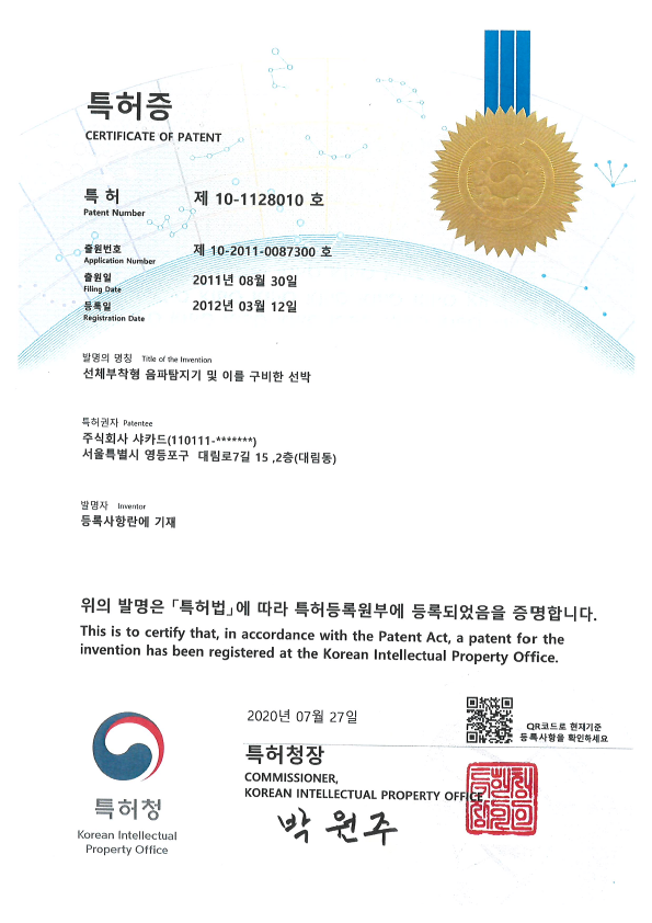 선체부착형 음파탐지기 및 이를 구비한 선박 최고관리자 2023-07-18 최고관리자 Patent certification 0 95 2023.07.18 15:37 admin@domain.com 선체부착형 음파탐지기 및 이를 구비한 선박