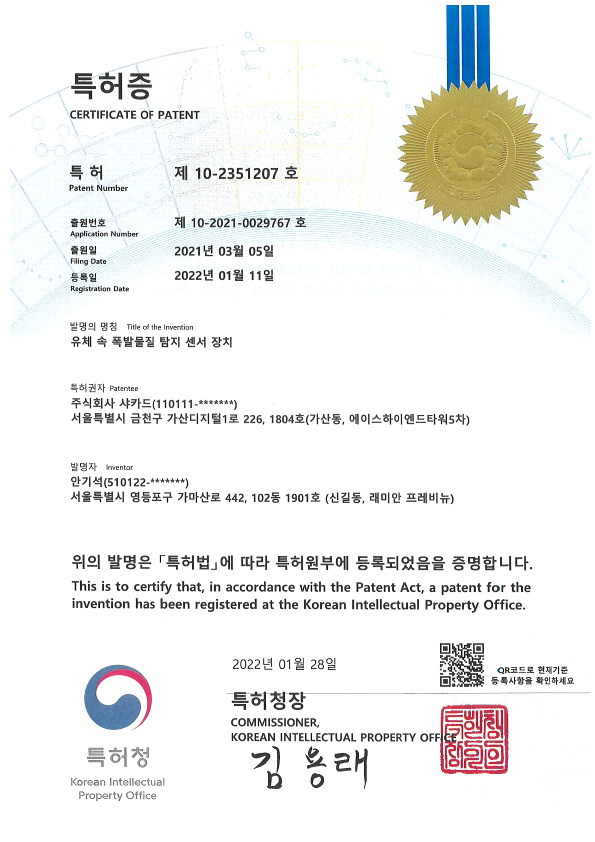 유체 속 폭발물질 탐지 센서 장치 최고관리자 2023-07-18 최고관리자 Patent certification 0 94 2023.07.18 15:42 admin@domain.com 유체 속 폭발물질 탐지 센서 장치